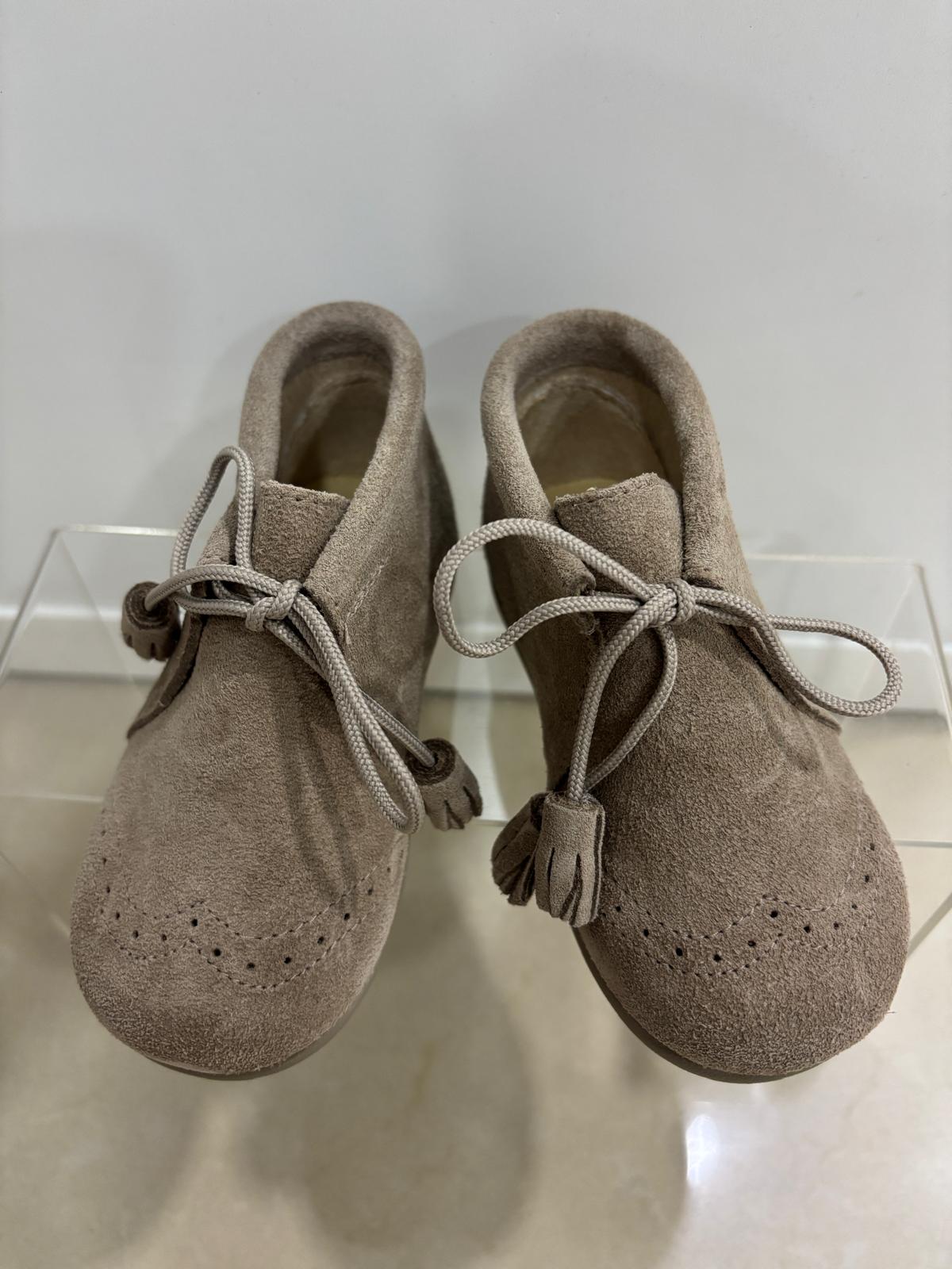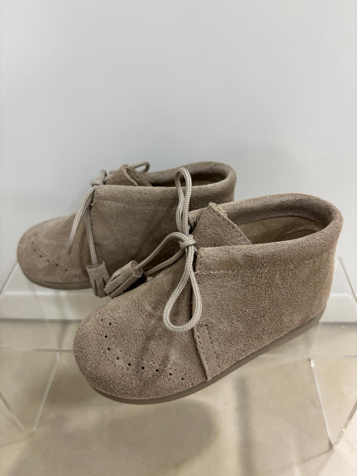 • Botas unisex en cerraje de color piedra, con detalles picados en la parte delantera y cordones con borla
