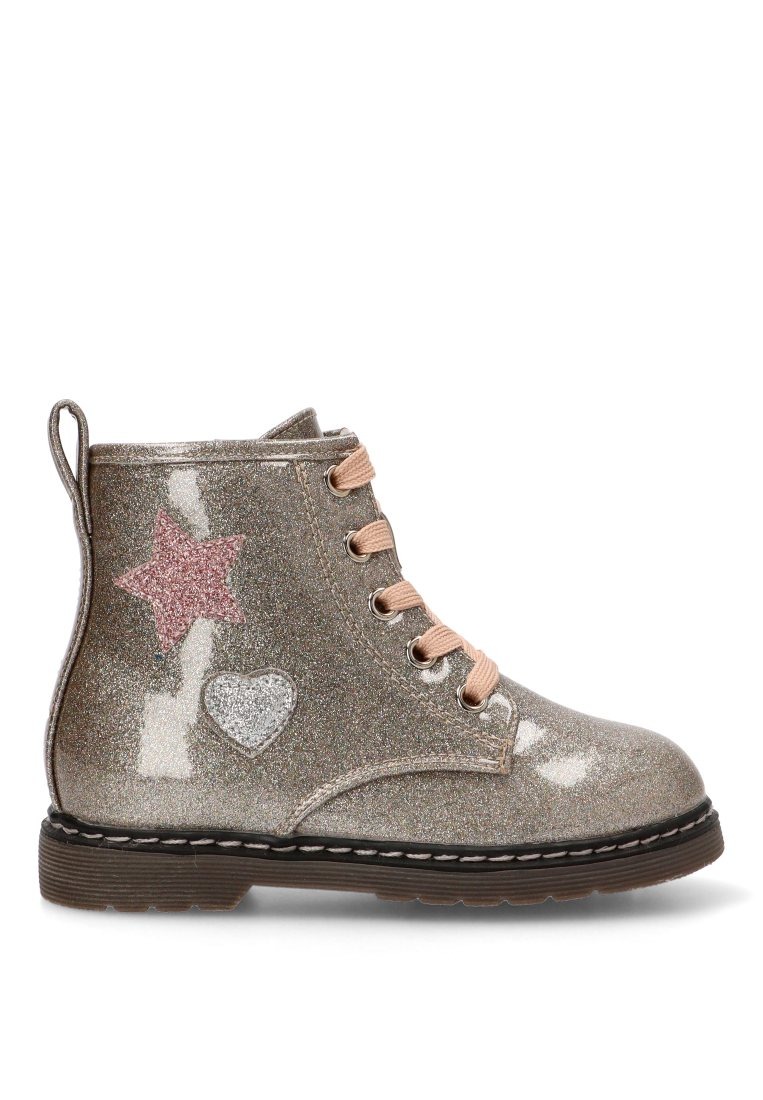 • Bota de niña en color champan y gliter y unos corazones una bota que a las niñas le van ha encantar ya que sus detalles enamoran