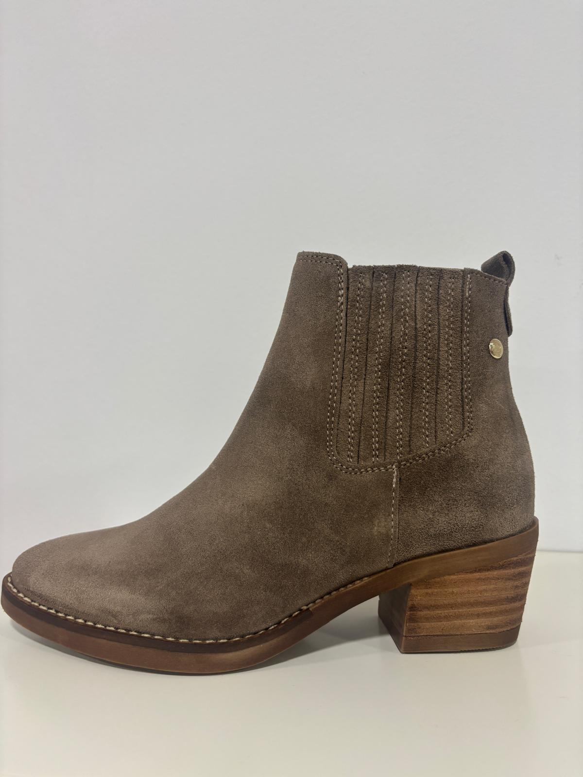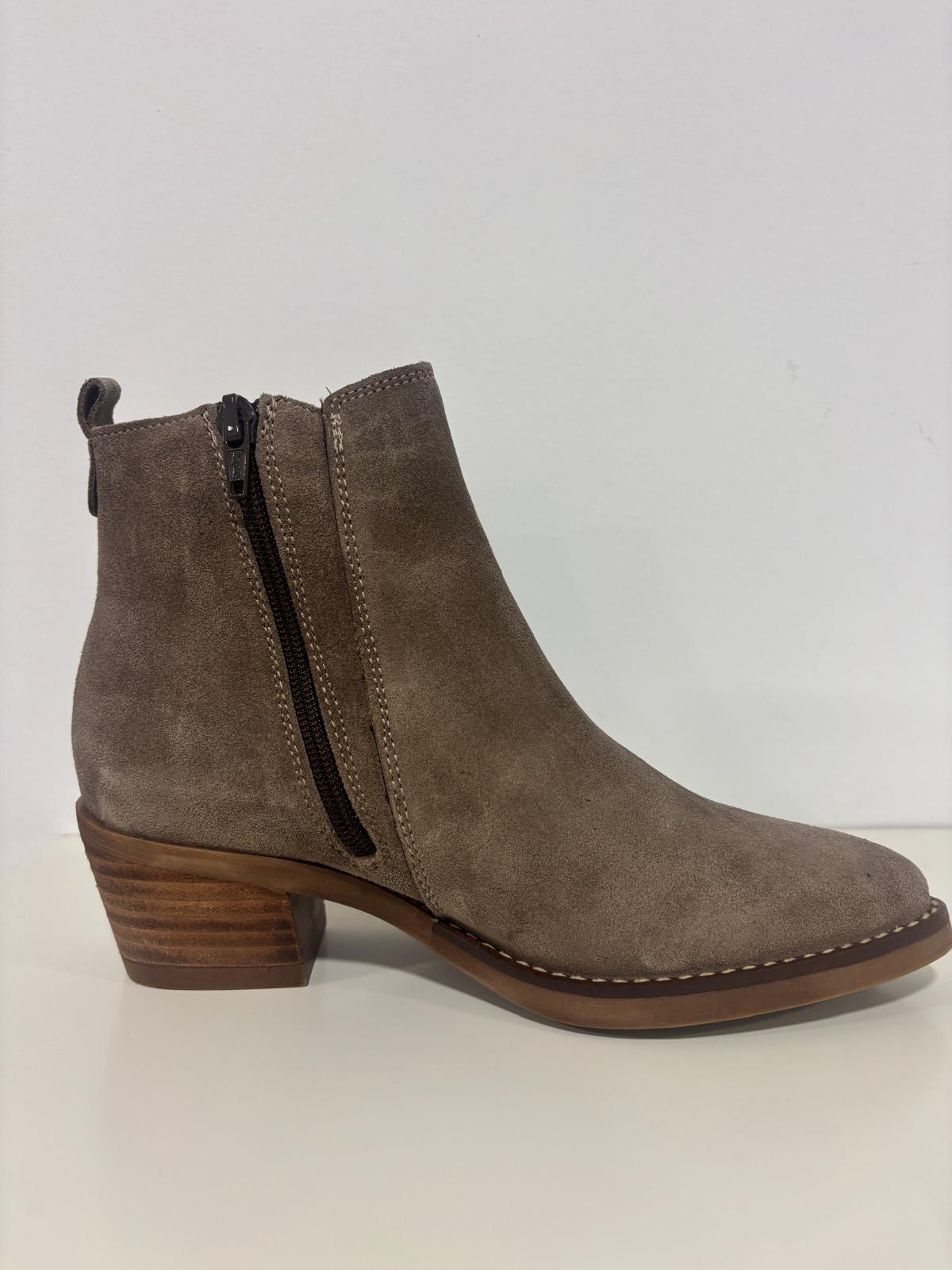 Botín de piel en color topo en ante, con cremallera en la parte interna y tacón de madera. muy suave al tacto y cómodo