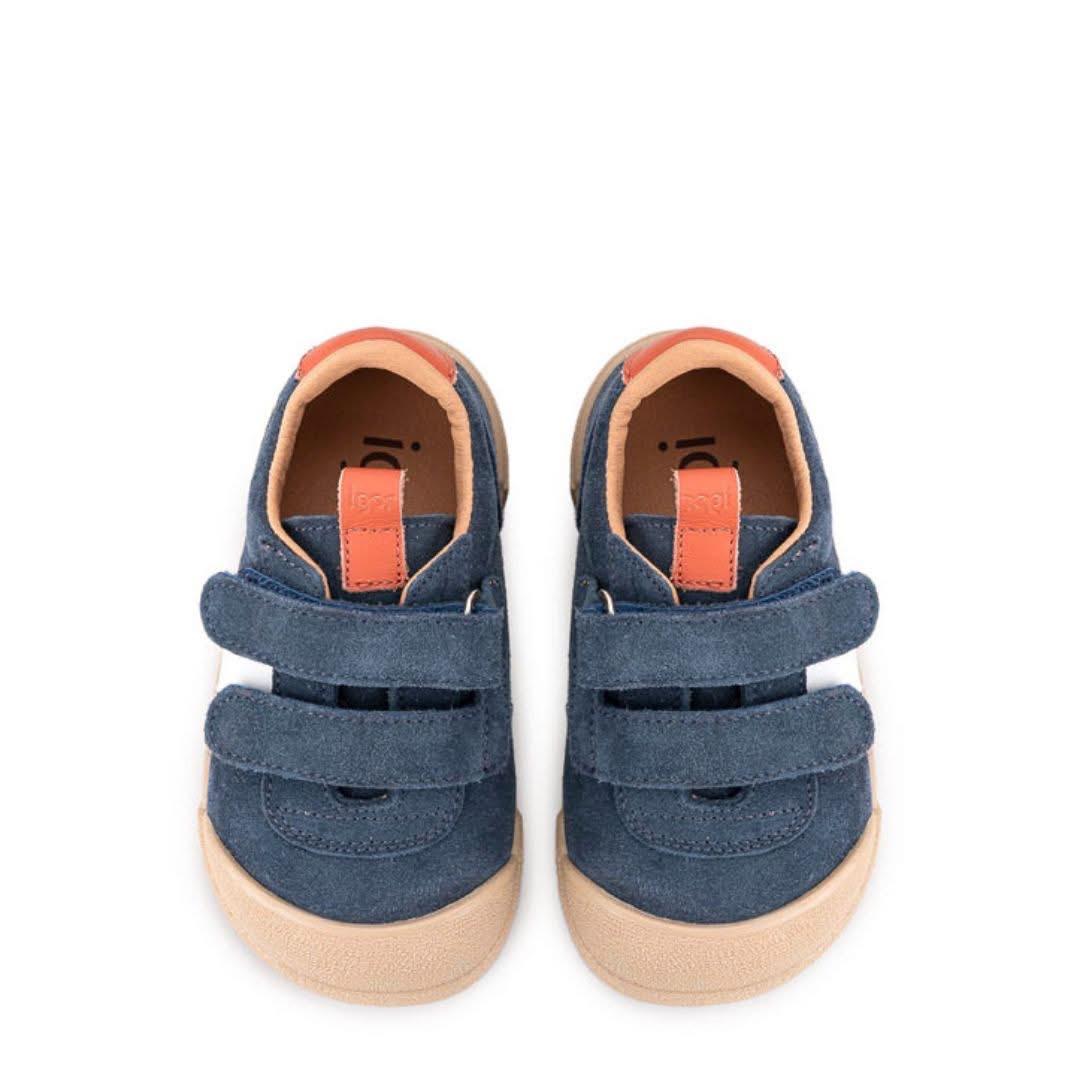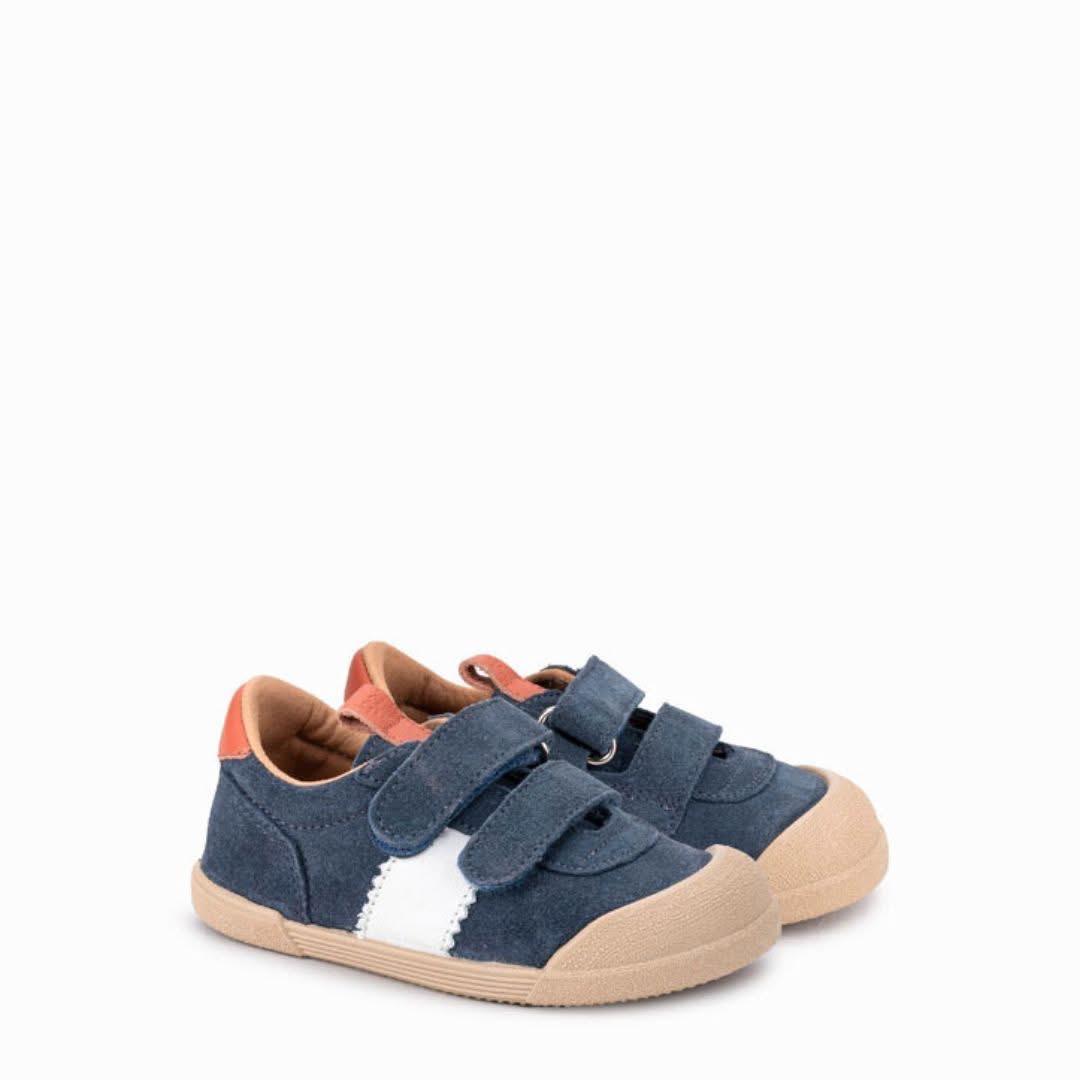 Deportiva barefoot de igor, en cerraje de color Marino combinada con naranja y una franja en blanco. Horma neutra y puntera ancha y reforzada para evitar rozaduras. Son ligeras, flexibles y resistentes. Una deportiva casual ideal para el día a día para combinar con cualquier looks