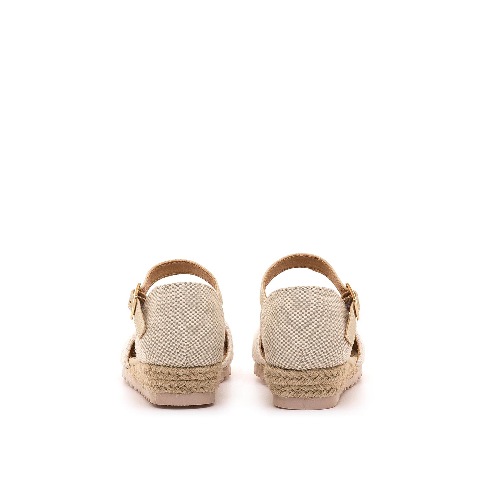 • Esparteña en tonos beige con un poco de cuña, parte trasera cerrada y con uno suela acochada que la hace muy cómoda, suela de goma, ajustable con hebilla