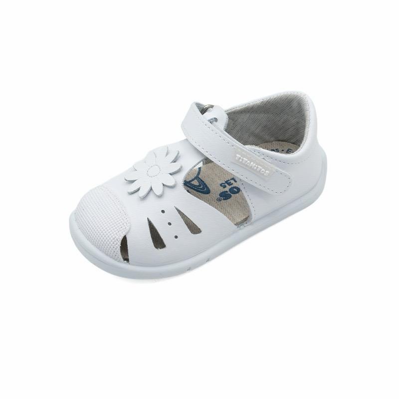 Sandalia en blanco de piel lavable de Titanitos. Una sandalia con puntera reforzada y muy versátil y cómoda ya que su fácil limpieza la hace aún más cómoda para su uso diario. Ajustable con velcro para más comodidad