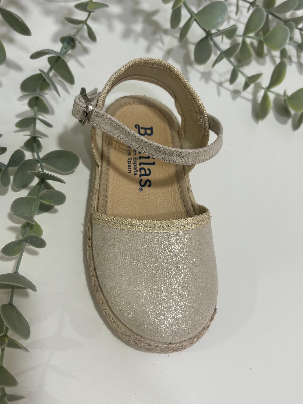 • Valencianas o también llamadas esparteñas en dorada con suela de esparto plana